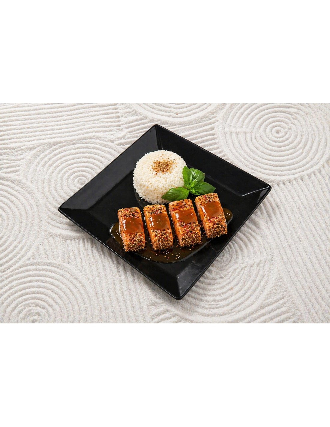 Salmón grillado con sesamo tostado y pimienta togarashi, acompañado con salsa Miso y una guarnición de arroz con sésamo.